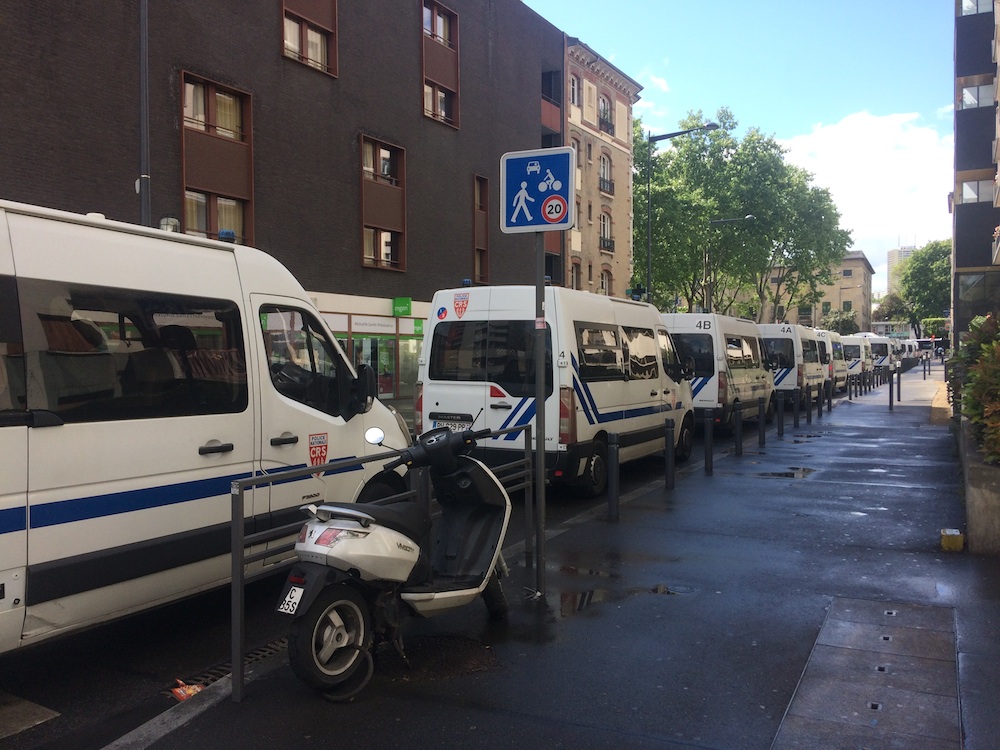 Fête des CRS confinés dans les véhicules stationnés sur la place de la mairie cet après-midi
