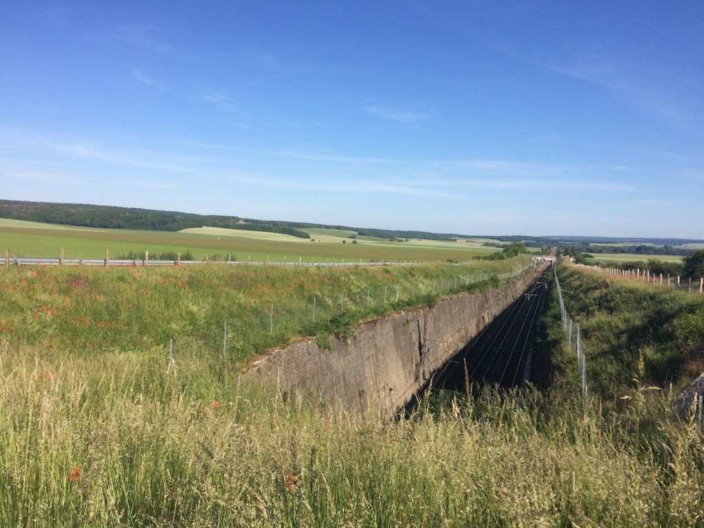 Quand je l’ai photographiée, en mai dernier, la lumière crue et la végétation encore verte accusaient son air d’abandon, juste à l’entrée du tunnel. Désaffectée depuis des années, elle voit passer les TER et les trains de marchandise, dont le vacarme retentit, la nuit, dans les jardins, et jusque dans les maisons, par les cheminées.