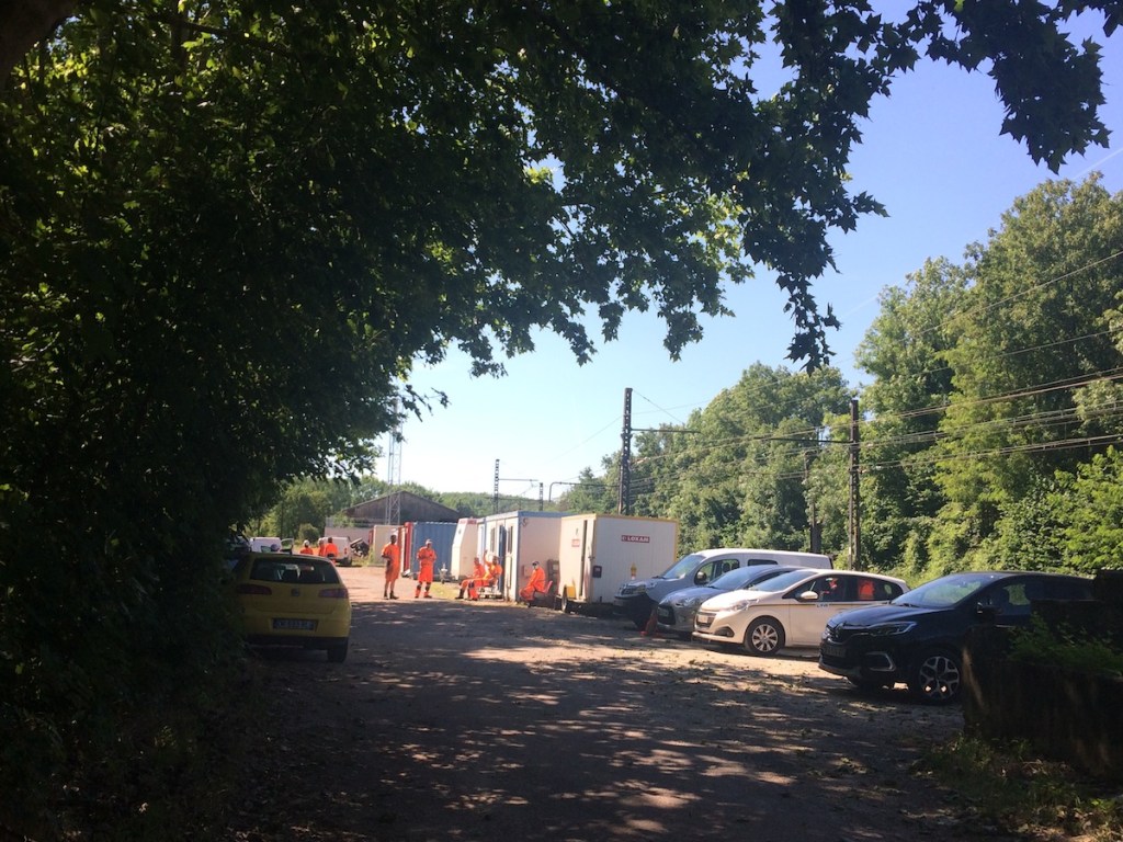 Ceci encore. Ce jour de mai où je photographiais la gare de Lézinnes déserte, emblème local de déréliction, j’en ai été presque empêchée par un groupe d’ouvriers vêtus d’orange pétant, qui faisaient la pause, près de leurs baraques de chantier OXAM, avant de retourner travailler dans le tunnel. On ne s’est pas dit grand-chose, mais que des amabilités. Il faisait chaud. Ils étaient gais. Bien et bons vivants. Et ils m’ont permis de les prendre en photo.