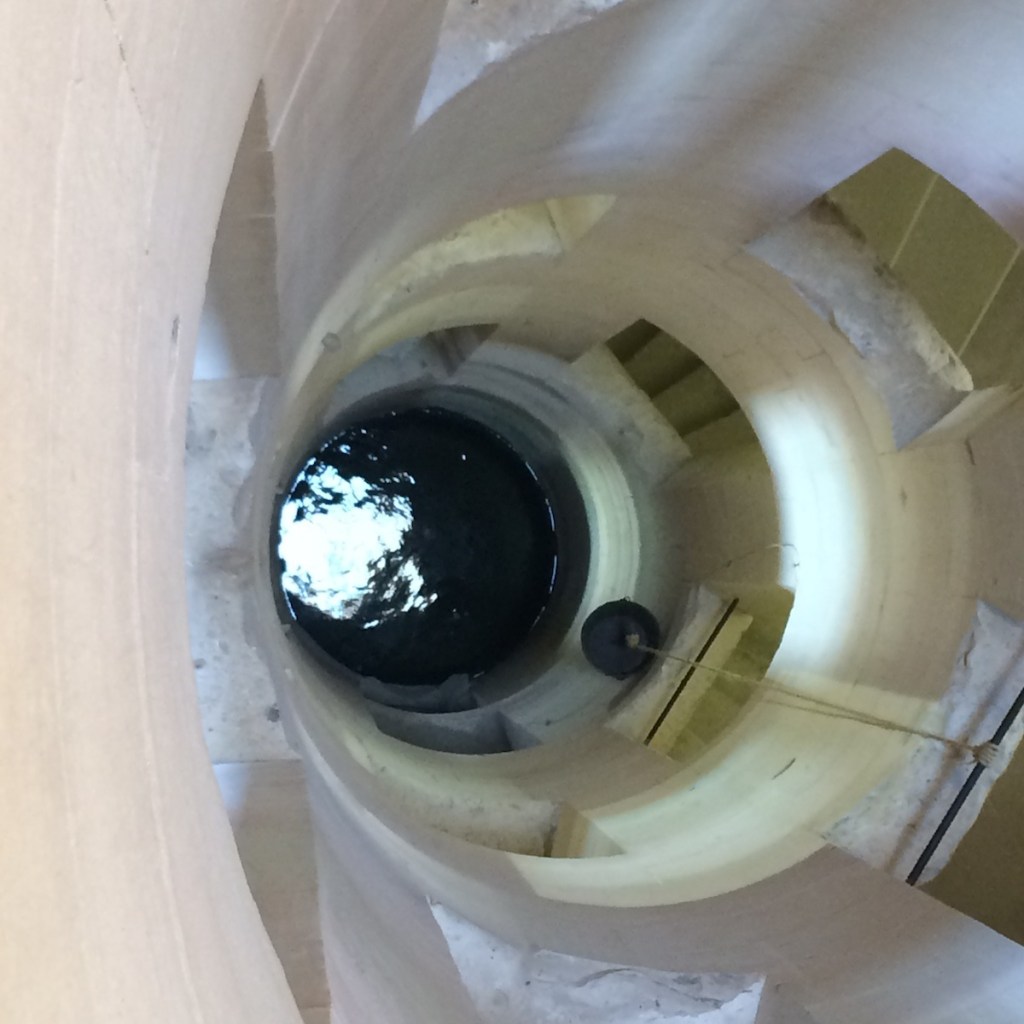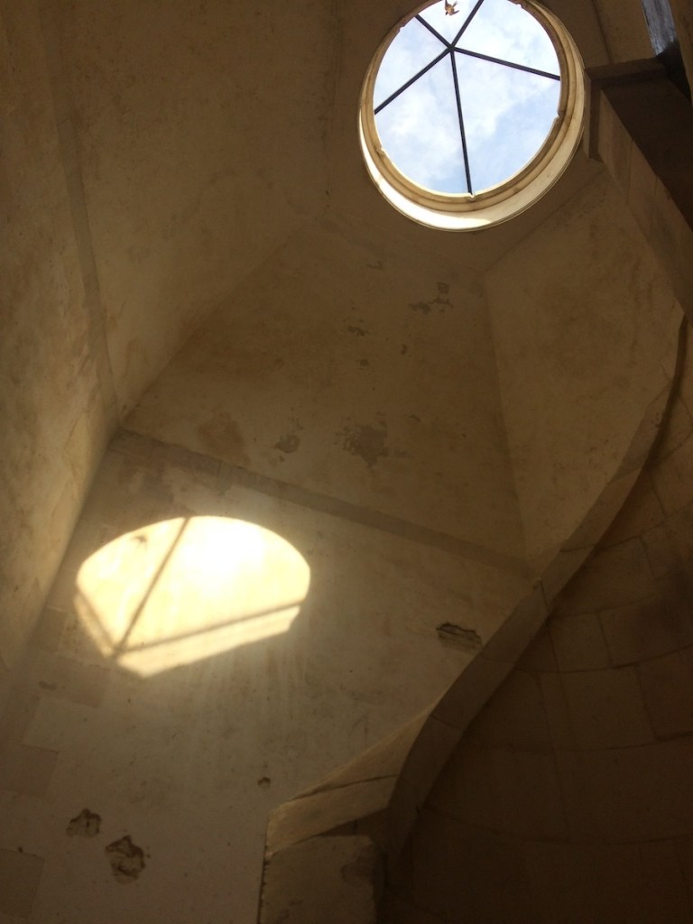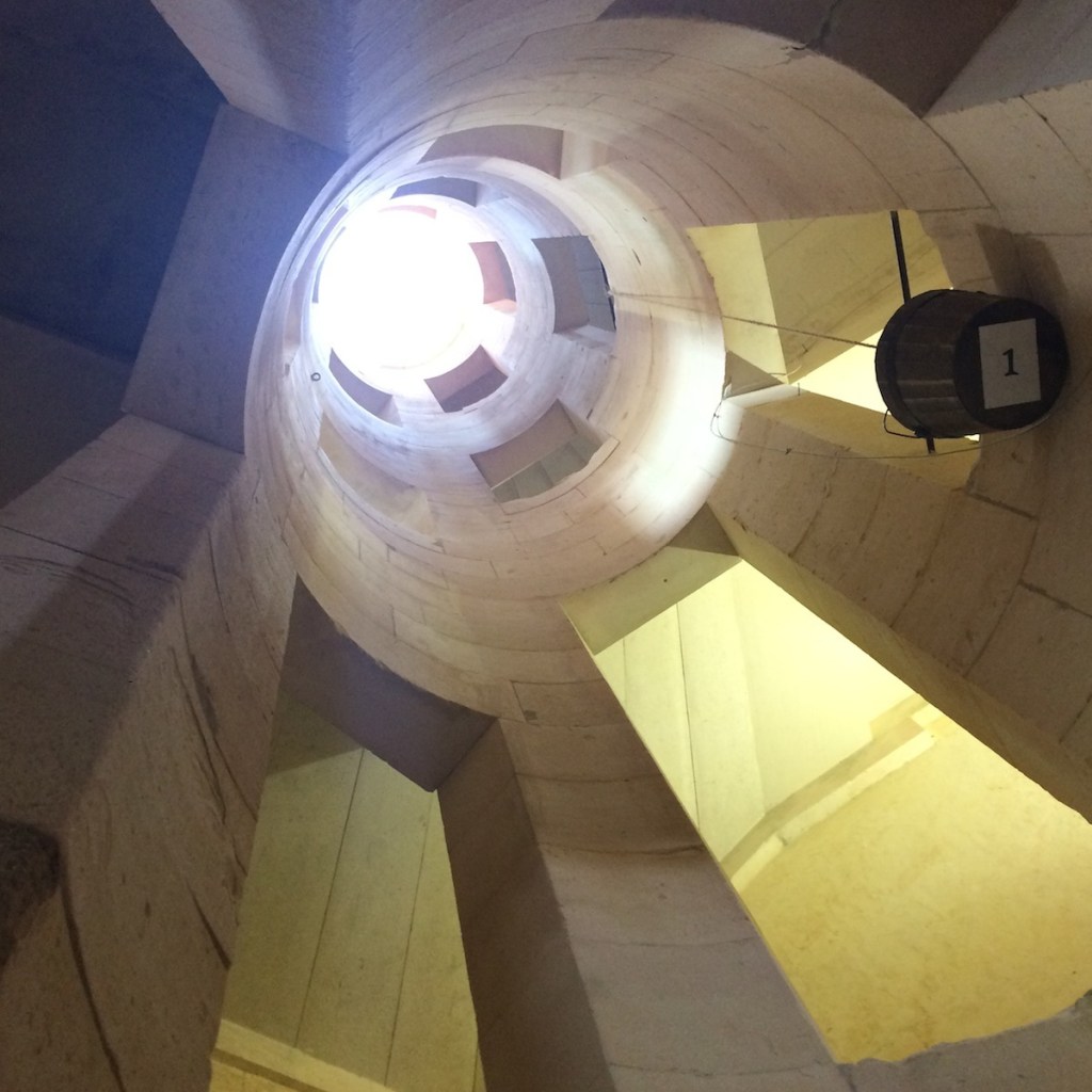 On monte au sommet du château par l’escalier vertigineux qui s’enroule autour d’elle, on se penche – son œil rond luit dans l’ombre, tout au fond. On lève la tête – le puits de lumière tout là-haut – l’œil du ciel prisonnier, si loin.