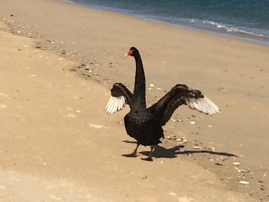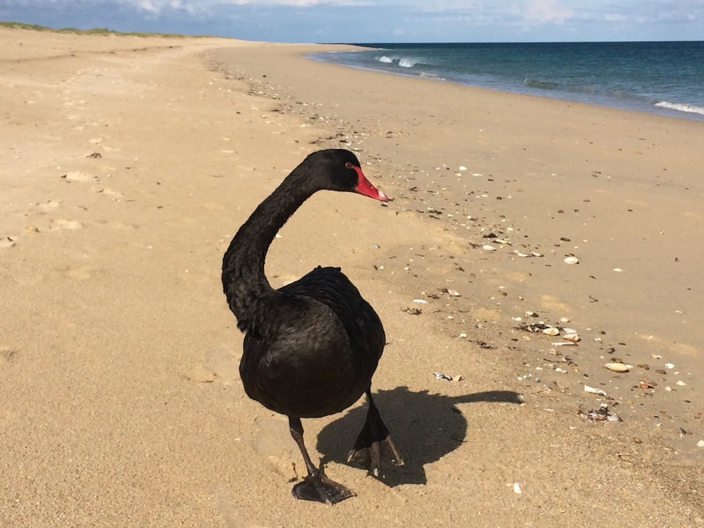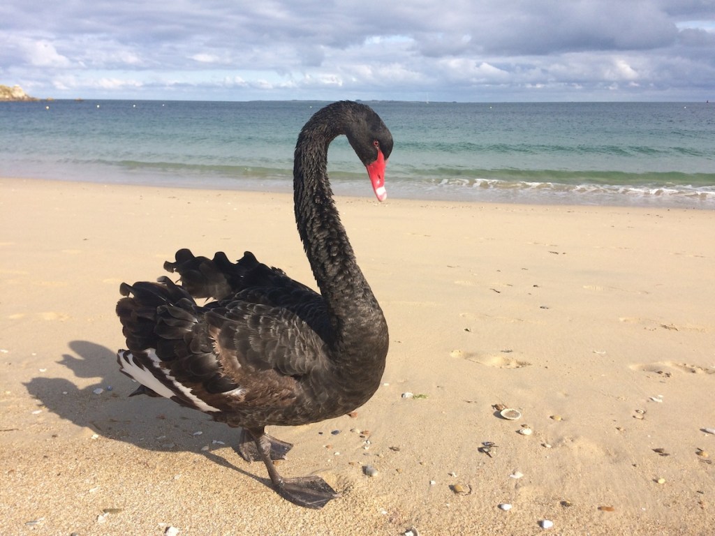 Peu après, j’ai découvert l’existence de la théorie du cygne noir : mon ami de la nature était donc sans doute victime du syndrome « tous-les-cygnes-sont-blancs ». Je n’ai pas lu le livre de Nassim Nicholas Taleb, mais je salue l’oiseau extra-ordinaire, qui a choisi cet ilot de l’Atlantique pour se poser, un temps. Moins pour ce qu’on peut lire sur internet (- génial ! ce virus imprévisible, ce grand bouleversement, c’est le type parfait de l’évènement-cygne-noir !), que parce que ce matin-là, sur le rivage lumineux, black était vraiment beautiful, et le rouge de son bec, le rouge de ses yeux, sidérant.
