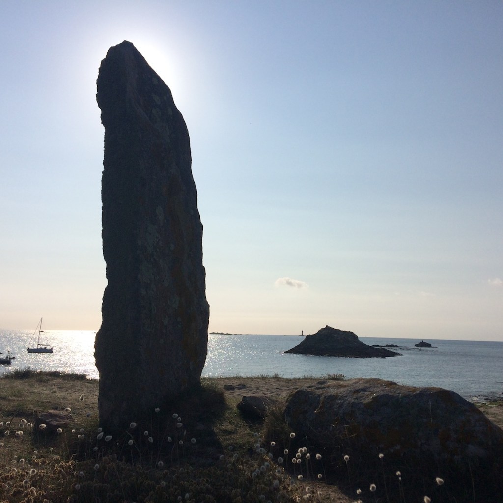 Derrière chez moi, enfin, derrière le fort d’Hoëdic, y a un étang. Un sentier y conduit, entre les herbes, à quelques pas de la plage. Si vous ne le connaissez pas, vous ne le verrez pas. Pourtant, à l’entrée du sentier, au dessus de la mer, il y a un menhir. Le menhir de la Vierge. Aux pieds du menhir, une grosse pierre taillée en creux, elle aussi constellée de lichens roux. La femme du menhir, peut-être. Ce creux rond pourrait recevoir de l’eau, un œuf géant, une pâte à pétrir, un corps à sacrifier, du sang …