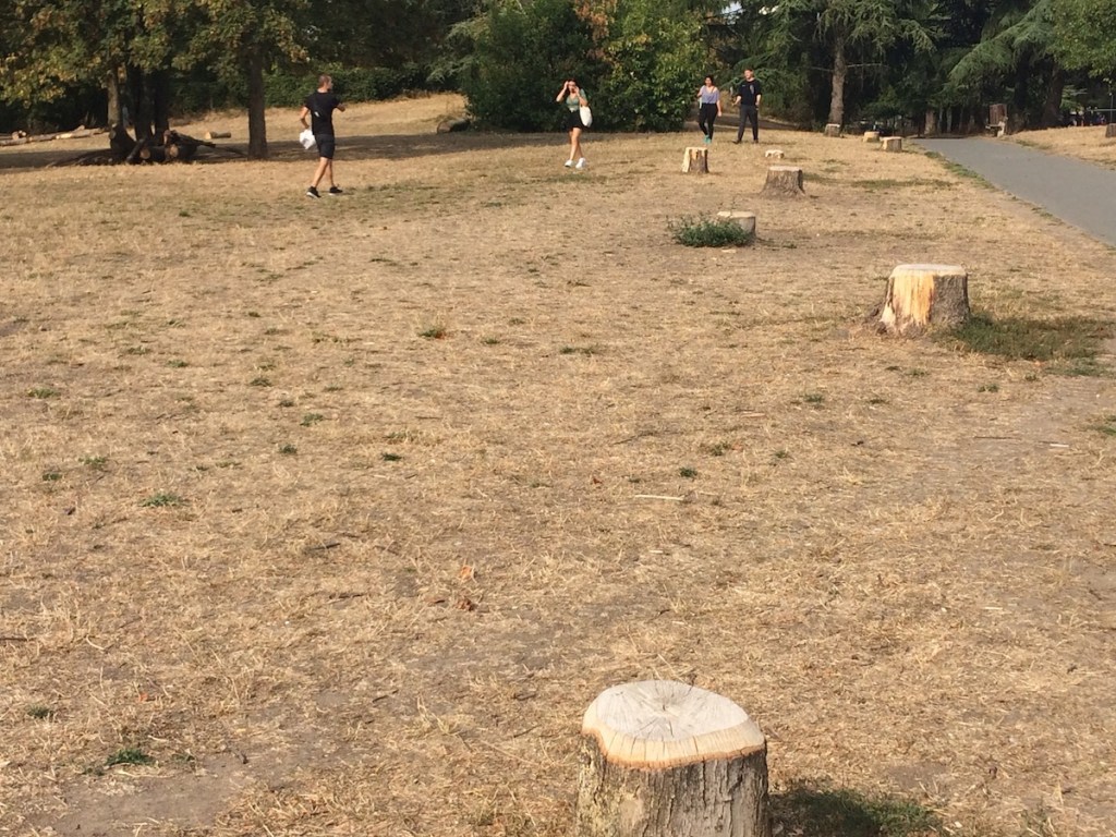 Fin juillet déjà, des arbres du parc étaient roussis comme en octobre. À la fin de l’été, plus de prairie : une savane ; la mare avait rétréci – une flaque. On s’attendait, le soir, à y voir débouler les lions, les gazelles. À l’entrée du parc, la grande pelouse était ratatinée – un paillasson très ras. D’autant plus sahélienne, que beaucoup d’arbres venaient d’y être coupés.
