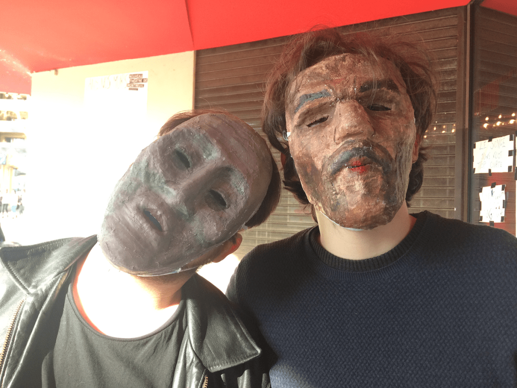 Ils ont collé plein d’affiches sur les portes, ils ont fabriqué de très beaux masques, et tous les jours, à 16h, ils jouent – pantomime, petit concert, interactions diverses avec les badauds….
