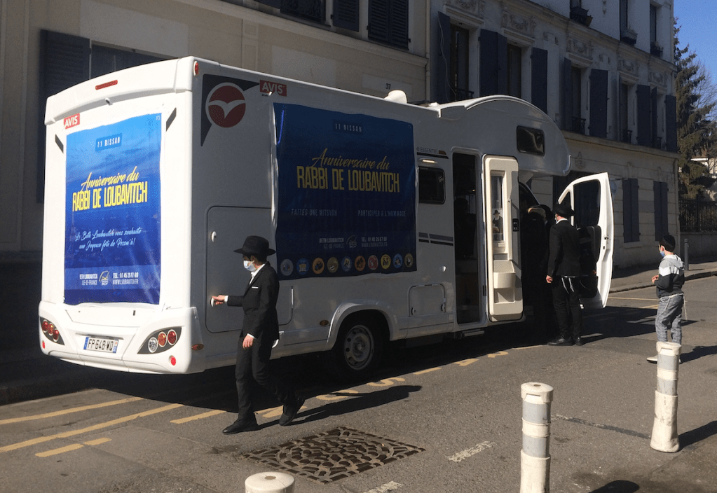 …c’est un camion du Beth Loubavitch, qui célèbre l’anniversaire du Rabbi de Loubavitch par des annonces tonitruantes. – Je discute avec l’un des jeunes du camion : on distribue des bonnes choses me dit-il, des lectures aussi, on aide ceux qui en ont besoin, on prépare Pâques…
