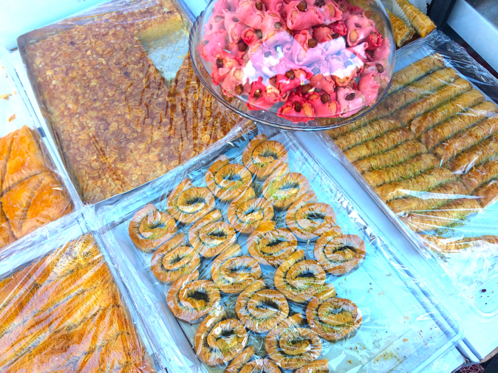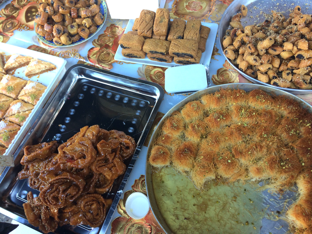 Les devantures des magasins d’alimentation qui depuis deux semaines, comme chaque année, présentent de somptueux plateaux de dattes et de pâtisseries multicolores, par exemple.