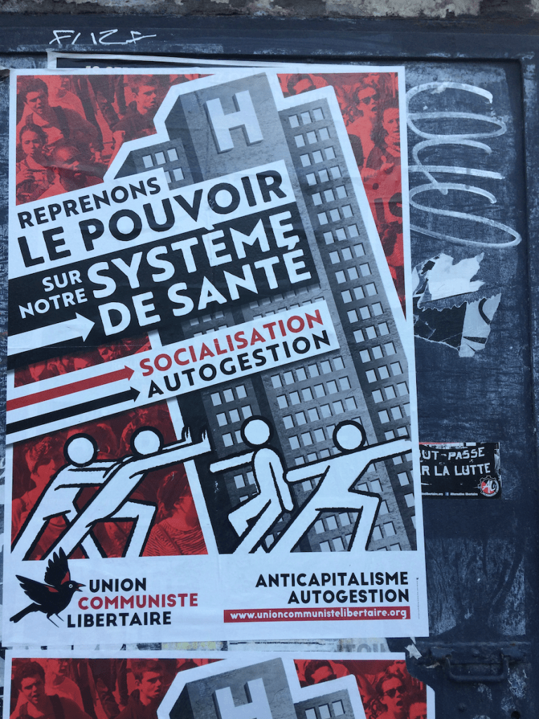 … « Reprenons le pouvoir sur notre système de santé », disait un peu plus loin, un oiseau noir taché de rouge, sur l’affiche rouge et noire de l’union communiste libertaire.