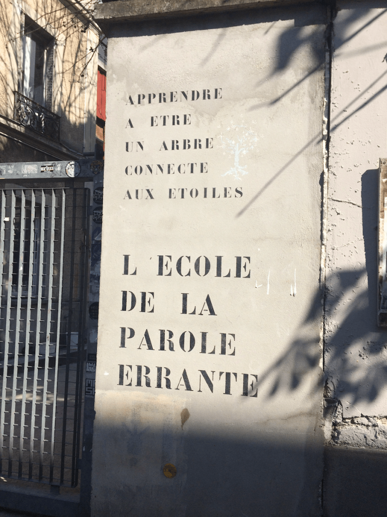 … « De la fréquentation assidue des lisières dépend l’entrée dans les métamorphoses. Venez prendre la parole » : Bon. Rue François Debergue, La Parole Errante était toujours là, sous les marronniers qui ont déjà leurs feuilles. C’est Armand Gatti qui l’a amenée ici, en 1997. Pas loin il y a la librairie Michel Firk, sur laquelle pousse toute une forêt. Il paraît qu’ « apprendre à être un arbre connecte aux étoiles. »