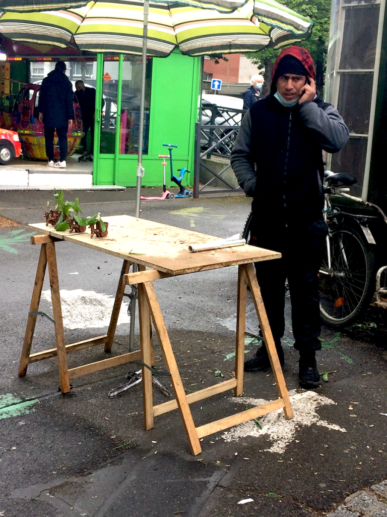 Pas de manif non plus : fallait aller à République. Juste quelques affiches. Rien, partout, que plein de gens qui se hâtaient de faire leurs courses « essentielles », comme chaque samedi. En plus il pleuviotait. Tu parles d’un 1er mai.