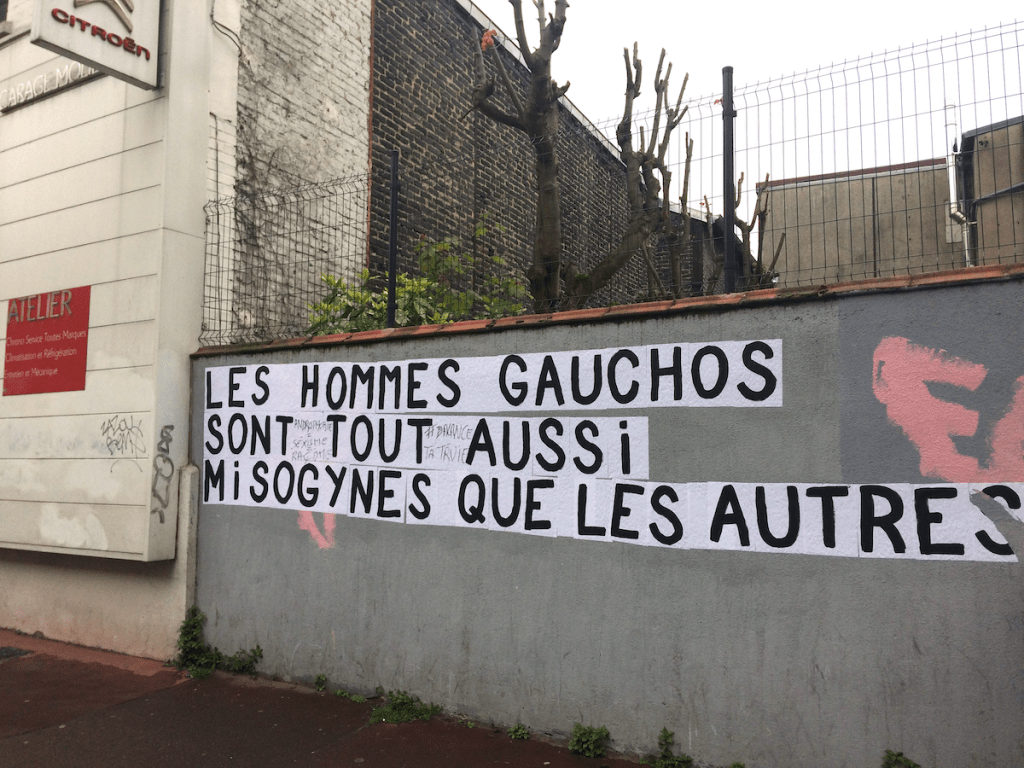 … LES HOMMES GAUCHOS SONT TOUT AUSSI MISOGYNES QUE LES AUTRES, disait ce collage des colleuses, vers la Cité de l’Espoir