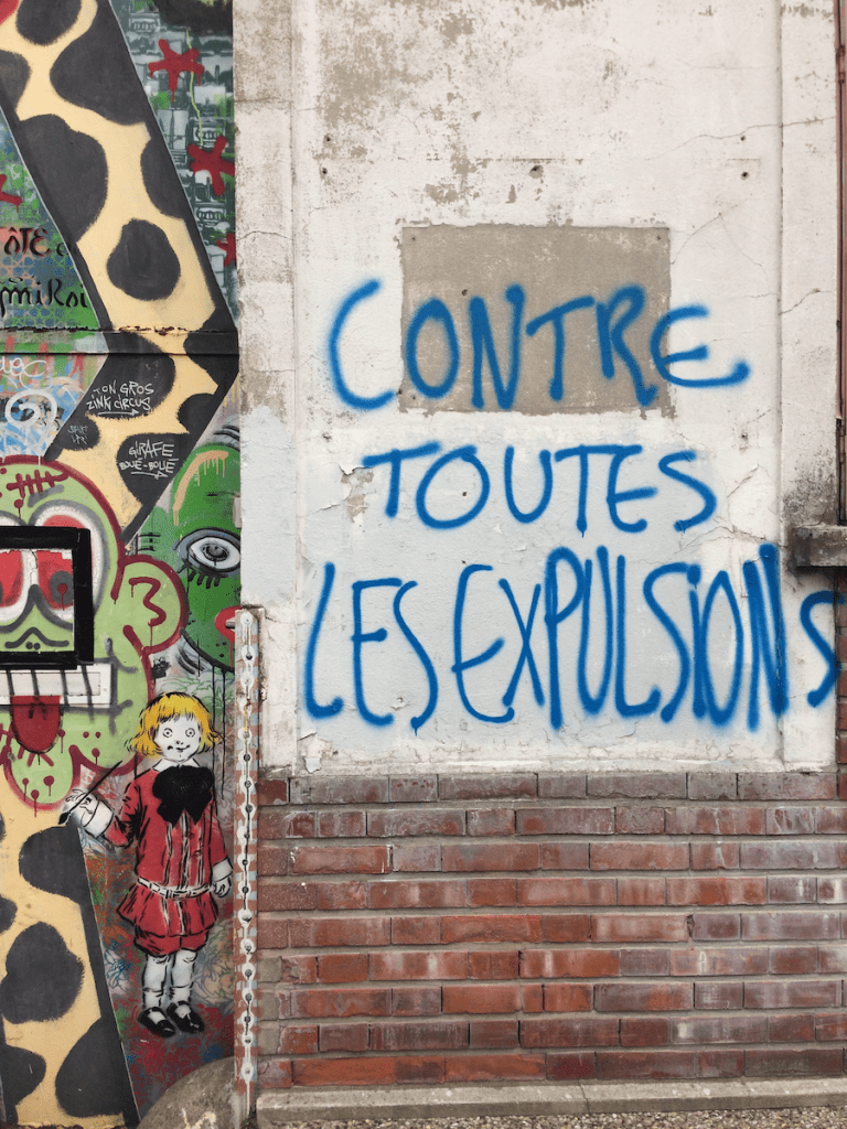 … CONTRE TOUTES LES EXPULSIONS, disait ce tag sur une fenêtre murée, vers l’avenue de Stalingrad. Juste à côté (regarde bien, tout en bas à gauche) le gamin genre Bécassine n’en croit pas ses yeux.
