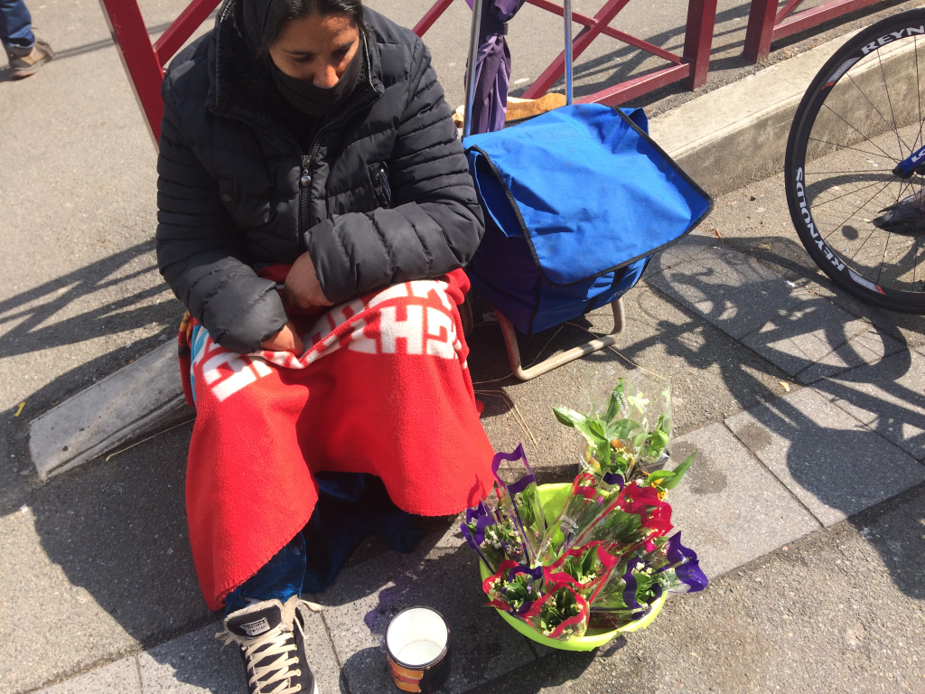 Et puis il y a les autres. Ceux qui arrivent de Roumanie ou d’ailleurs, et qui vivent le plus souvent dans des bidonvilles – comme celui des Acacias, l’an dernier : 400 personnes qui ont levé le camp du jour au lendemain à l’annonce du confinement. Ce sont eux qui font la manche, autre boulot. Il y a les habitués (de vieux hommes, des jeunes femmes avec bébés), invariablement aux mêmes postes stratégiques : sorties du métro, trottoirs devant les boulangeries, sorties des supermarchés. Il y a ce vieil homme voûté très maigre, qui depuis une éternité porte le même mince costume grisâtre, hiver comme été. Dans la soirée, il descend sur le quai du métro, et il y reste, debout jusqu’à la dernière rame : d’une main, il tient son col serré sous le menton, comme s’il marchait dans la toundra sous la neige. Il ne dit jamais rien. II tend son autre main, très grise aussi. Peu de gens s’arrêtent pour lui donner.