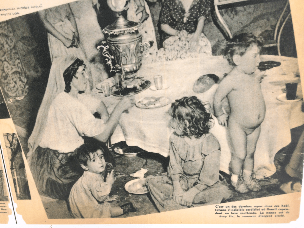 Un panneau reproduit un article de Pour elle, le 28 mai 1941. C’est un reportage dans « la Zone », à Montreuil : les « Tsiganes » y vivaient alors dans des baraques, des tentes et des roulottes. Il y a une photo étonnante : des princesses autour d’une table basse, un enfant nu, d’autres déguenillés – et cette légende : « c’est un des derniers repas dans des habitations d’indicible sordidité où fleurit cependant un luxe inattendu. La nappe est de drap fin, le samovar d’argent ciselé. » Car, alors… « Les Tsiganes s’en vont. »
