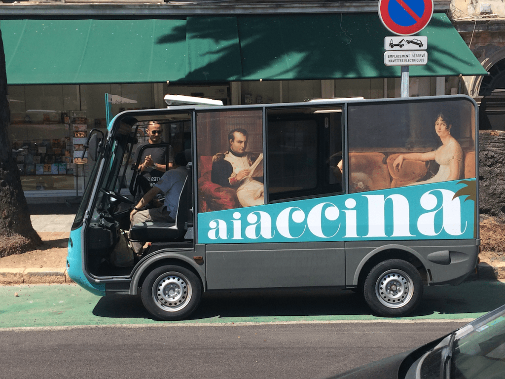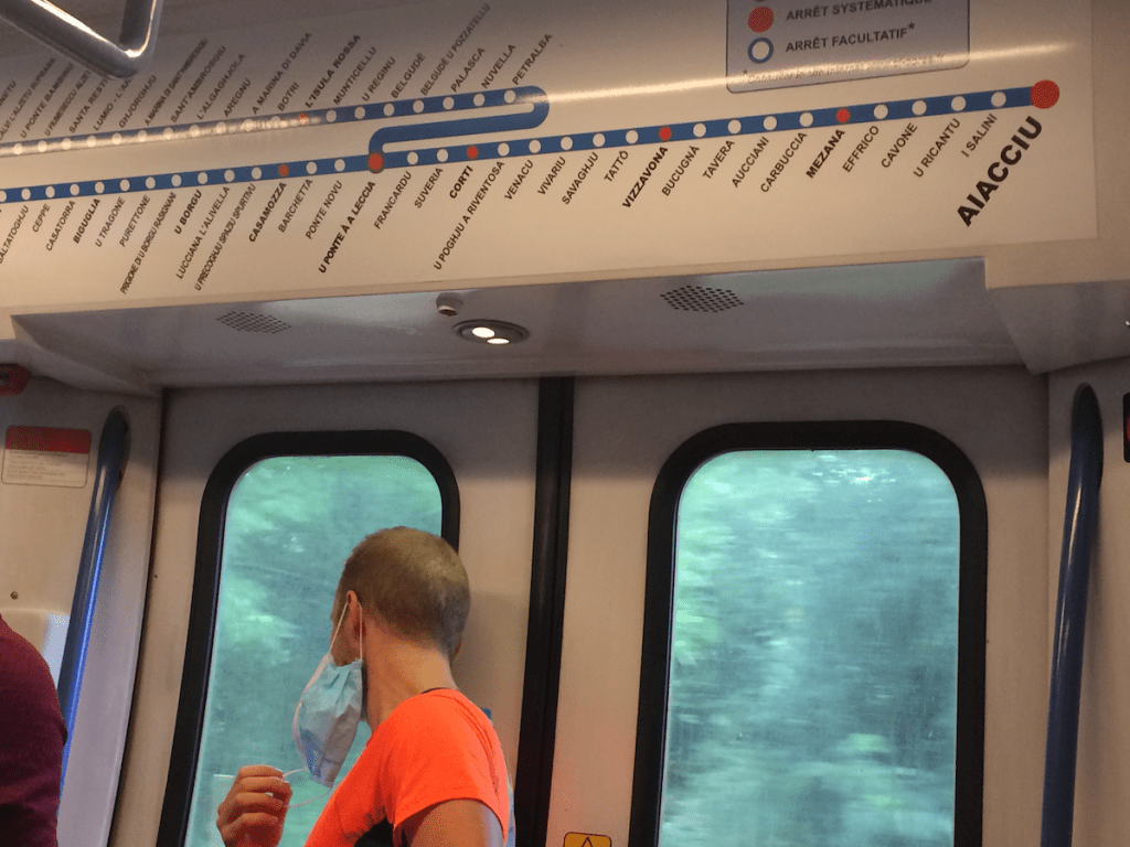 À l’intérieur, silence indifférent – les voyageurs sont maintenant des habitués. Mobilier, design… on se croirait dans le métro parisien. Au-dessus des portes des voitures, la ligne est affichée avec toutes ses stations, aussi nombreuses que celles de la ligne 9. Ici on ne change pas à Strasbourg-Saint-Denis, mais à U Ponte à A Leccia.