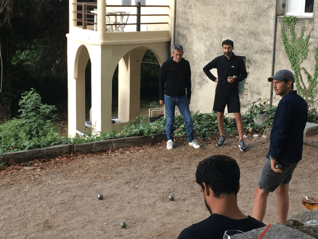 Une fois arrivés à Bocognano, halte choisie précisément parce que sur la ligne de chemin de fer, je me suis tout de suite dit que c’était de ce village de montagne que j’allais vous dire quelques mots. Sans savoir trop à quel sujet – à propos de cette terrasse peut-être ?… Des hommes, que des hommes au-dessus du terrain de pétanque, face à la haute muraille de la montagne…