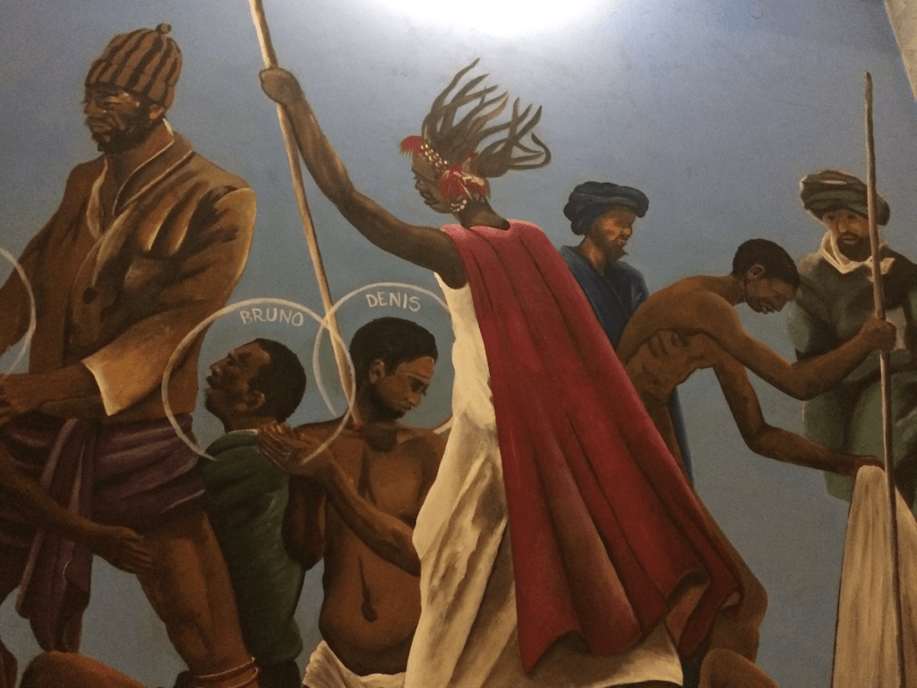Au cœur de Dakar, la cathédrale du « souvenir africain » a été édifiée en 1936 sur un ancien cimetière lébou, ce peuple qui vit ici de la mer, depuis toujours. Une étrange fresque y célèbre un martyre plus étrange encore… Pour l’instant, je ne suis pas encore arrivée à savoir qui en est l’auteur, ni quelle en est la signification exacte – mais il semble bien que là aussi, on ait réécrit l’histoire à l’envers. Ce sanctuaire colonial a depuis été dédié « À la Vierge Marie mère de Jésus le Sauveur. »