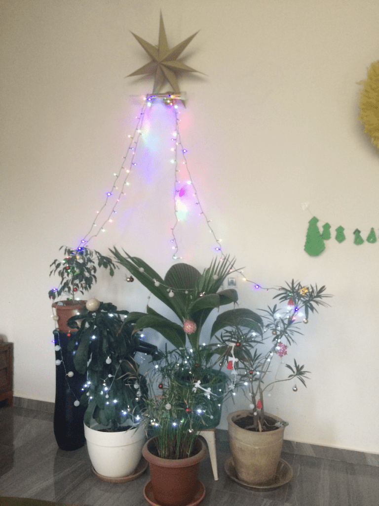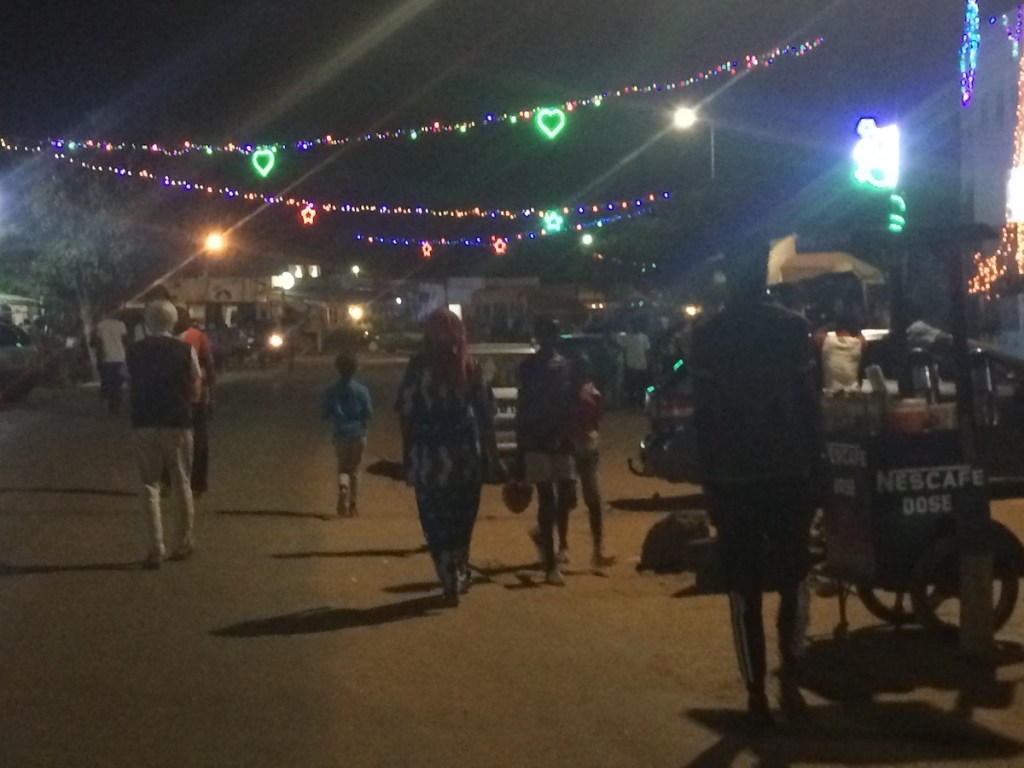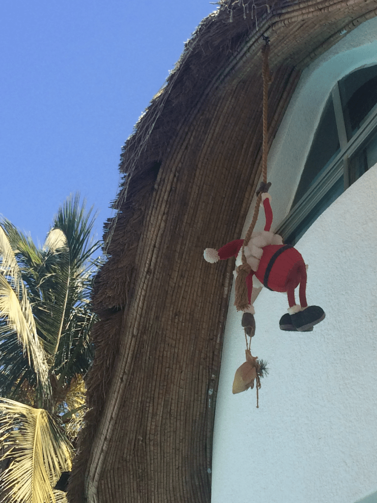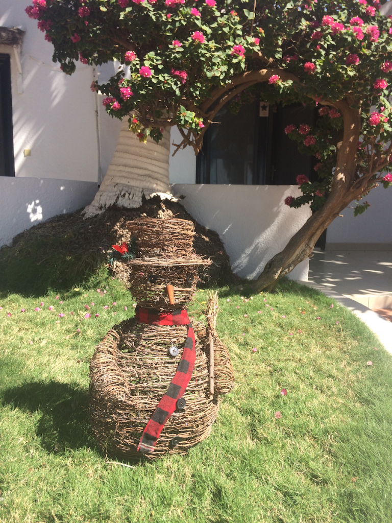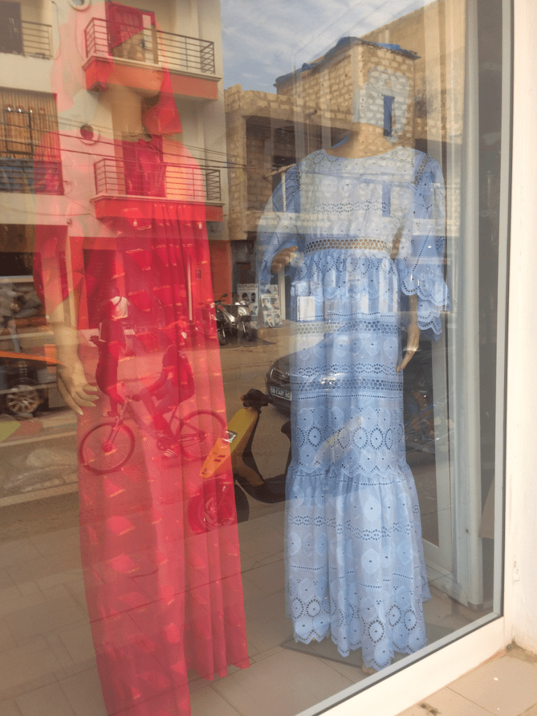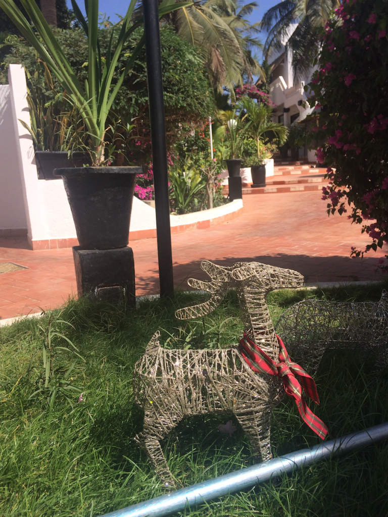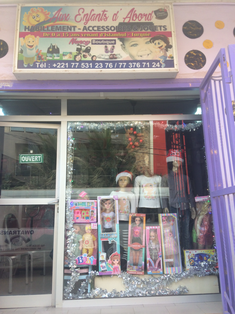 Et puis ici aussi, en ville, il y a des rues illuminées, des commerces ciblés, des « marchés de Noël ». À la maison, si on n’a pas trouvé de sapin en plastique, on fait un sapin sans sapin. En bas de chez nous, dans un faubourg de Dakar, il y a cette boutique de jouets enguirlandée. Partout, des vêtements de fête. Et sur la Petite Côte, dans la station touristique de La Somone, des bonshommes de neige en jonc sous 30° à l’ombre, des boules brillantes – et les mêmes créatures de rêve que rue de l’église, à Montreuil.