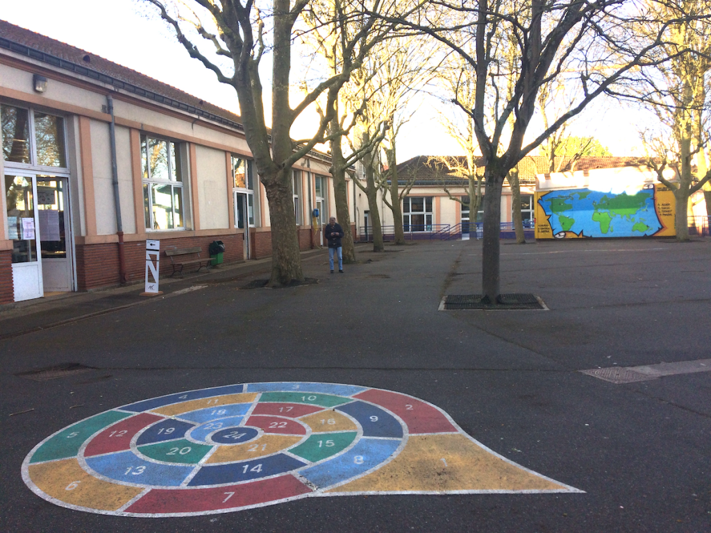 École de la République, avec sa marelle, sa fresque-mappemonde et ses drapeaux France-Europe. Nos filles y ont fait leur scolarité, l’une d’elles y a enseigné.