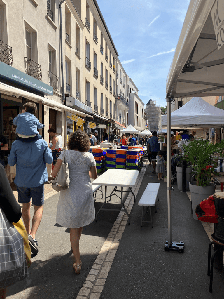 Vers 13h, la fête bat son plein sous le soleil. Les enfants se font maquiller, le photographe photographie avec son appareil à l’ancienne. Entre les portants du couturier africain Georges Lawson (très chics, ses vestes sont de vrais costumes de scène) et le bistrot-PMU d’en face (pour une fois, il y a même des femmes en terrasse), entre la boutique du tatoueur et la Maison des femmes, la poissonnerie Montreuil sur mer, la Petite épicerie bio, et le Fournil éphémère, le Montreuil plus ou moins friqué s’attable, se retrouve, refait le monde, se marche sur les pieds. Une dame distribue des tracts pour une société de ménage-repassage. Les praticiennes de l’Atelier ML présentent leurs cours de yoga-pilates-méditation.