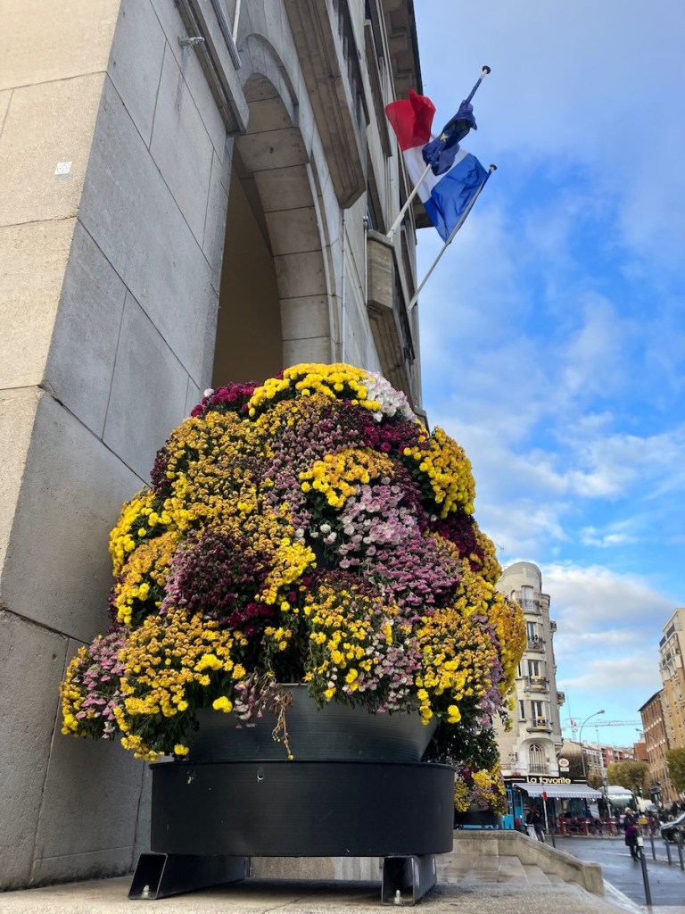 Depuis quelques jours – fin novembre, début décembre, on est entré dans cette période de l’année où fleurissent encore les chrysanthèmes de la Toussaint, et où se dressent déjà les sapins de Noël. À Montreuil, la mairie est fleurie des fleurs des morts, tandis que le sapin géant domine la place, bientôt planté dans une neige artificielle, un décor qui attirera les badauds.