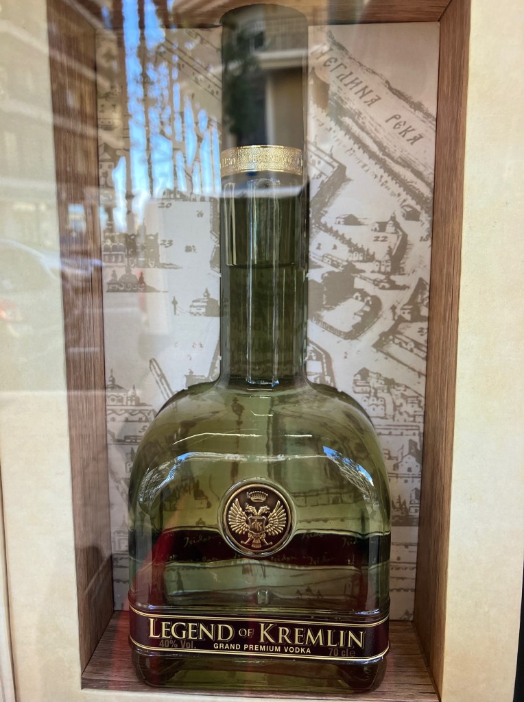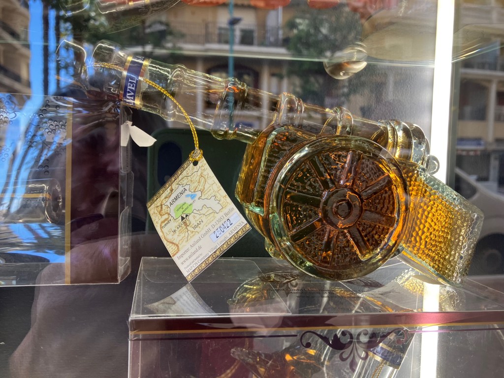 Derrière le Casino – boutiques chic, banques, terrasses enguirlandées, une étroite vitrine m’arrête net : je ne résiste pas au plaisir de vous faire entrevoir sa collection de canons de spiritueux et autres Légendes du Kremlin. Je pose quelques questions à la vendeuse – ma curiosité l’inquiète – oui elle est russe, un peu arménienne sur les bords, mais vous savez il n’y a pas que des Russes qui achètent ici, il y a des gens de partout, et beaucoup beaucoup de Français.