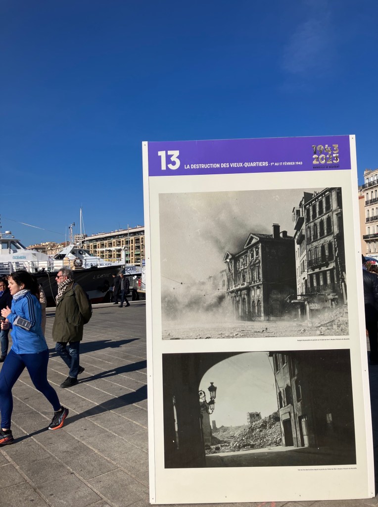 « Entre le 22 et le 24 janvier 1943, Marseille a connu un drame qui a marqué à jamais son histoire. Pendant plusieurs jours la ville a subi des rafles, des milliers de personnes ont été évacuées, déportées et la rive nord du Vieux-Port a été en partie détruite par des bombardements. » Beaucoup de gens regardent les panneaux disposés le long des quais – et découvrent la rafle la plus importante de France après celle du Vel d’Hiv, au pied du quartier disparu.