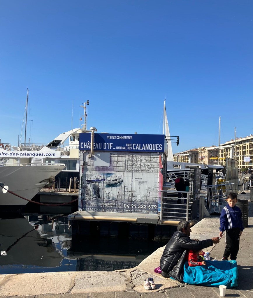 Une petite famille fait la manche au pied de l’embarcadère du Château d’If.