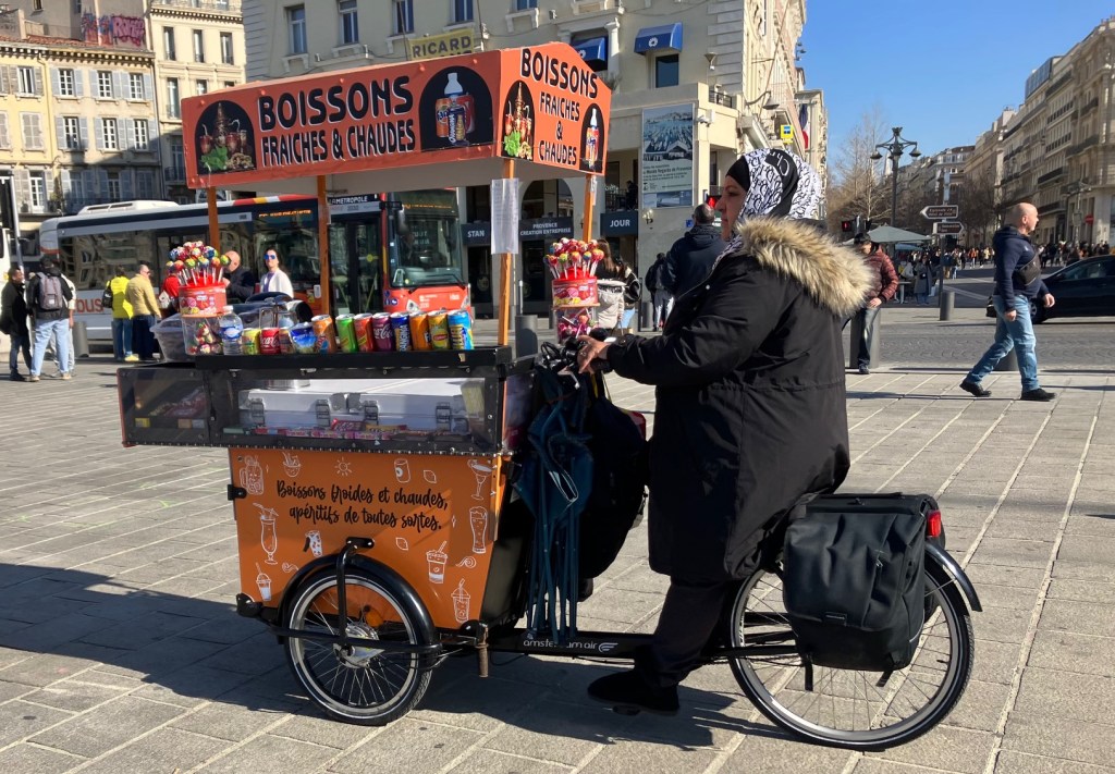 Un peu plus haut sur la Canebière, un homme venu d’Afrique plus ou moins du Nord ou d’Orient plus ou moins moyen, assis sur le trottoir, a posé un panneau devant lui : « SDF Bac + 4, donne cours d’anglais et de russe ».
