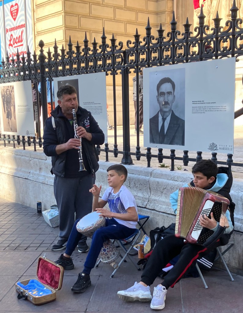 Ce matin, en bas de la Canebière, trois musiciens – le père à la clarinette, avec ses deux garçons, jouent des airs d’Europe centrale à faire danser les morts (une dame sans âge m’entraîne et m’embrasse) juste devant des portraits de marseillais déportés en 43.