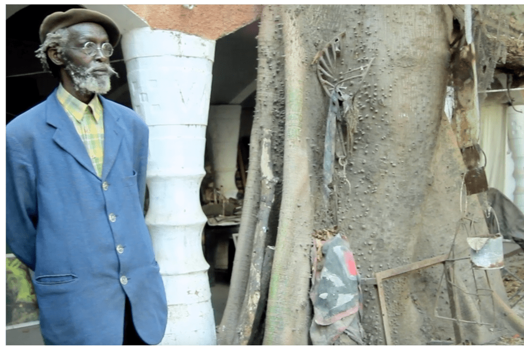 De loin en loin, une oasis – une rue dans laquelle sont plantés des palmiers, des eucalyptus, des acacias… Mais ici à Ouakam comme dans la rue Félix Faure de Ken Bugul, dans l’ancien quartier colonial du Plateau, c’est surtout dans quelques cours, quelques jardins cachés que s’abrite la verdure, qui parfois déborde par-dessus les murs. Les plantureux bougainvilliers aux couleurs violentes. Comme dans la cour magique de l’artiste-philosophe Issa Samb, dit Joe Ouakam (- oui, Ouakam, comme notre quartier), qui vivait il y a quelques années encore au pied de son arbre ( ça fera demain six ans qu’il l’a quitté), dans son jardin de trouvailles, vivant cimetière d’objets au rebut. Longuement, tranquillement, il nous avait parlé de son grand Fromager, des arbres des forêts voisines, de leurs âmes, et des bûcherons qui pactisent avec elles, pour choisir les individus dont ils extraient le bois des pirogues.