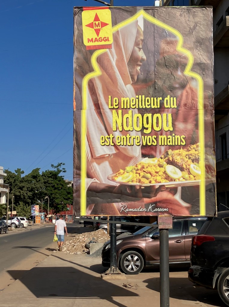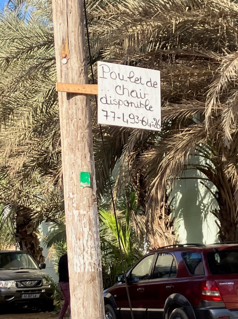 Le long de l’avenue principale, tous les vingt mètres, des affiches géantes nous rappellent que le Ramadan est une période faste pour les gourmands : ici, on raffole de ces repas si particuliers, sucrés ou lactés, du ndogou ( – le soir, à la rupture du jeûne) et du kheud (avant l’aurore) : de Bridel à Gloria ou Maggi, l’industrie alimentaire en profite – on trouve tout au supermarché comme chez le boutiquier – tiens, celui du coin est maintenant ouvert. Sans parler des éleveurs de viande, pour les grands repas de famille, comme ces « poulets de chair », dans notre rue.