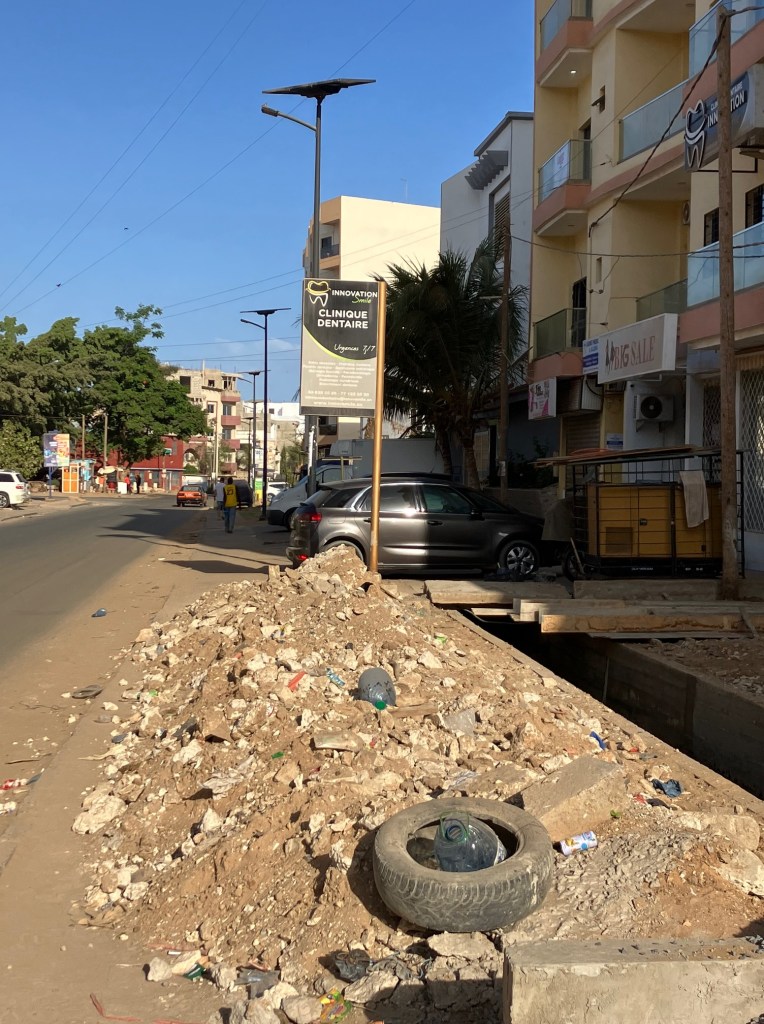 Autour de chez nous, les rues sont comme toutes les autres – y alternent immeubles et maisons basses, bâtiments en construction, travaux inachevés – matériaux, canalisations abandonnés, routes défoncées ou récemment goudronnées, amoncellements de débris et de détritus, sur lesquels parfois s’accrochent de petites plantes rampantes. Plus visiblement encore que l’an dernier – je ne croyais pas la chose possible – Dakar est un gigantesque chantier. La ville pousse en hauteur : en dépit de sa force, jamais le baobab n’arrivera à en faire autant. Elle accroît sa population et multiplie les voitures. Dakar est un gigantesque embouteillage. Jamais le baobab et ses mille confrères feuillus du quartier ne parviendront à faire respirer tout ça. Il y a bien ici un vaste espace vide, une ancienne base militaire à reconvertir en on ne sait quoi encore, et surtout l’ancien aéroport désaffecté – ce ne sera pas hélas, ou si peu, pour offrir un poumon vert à ce quartier surpeuplé : 10 hectares seraient dédiés à un projet de parc, et 590 aux promoteurs.