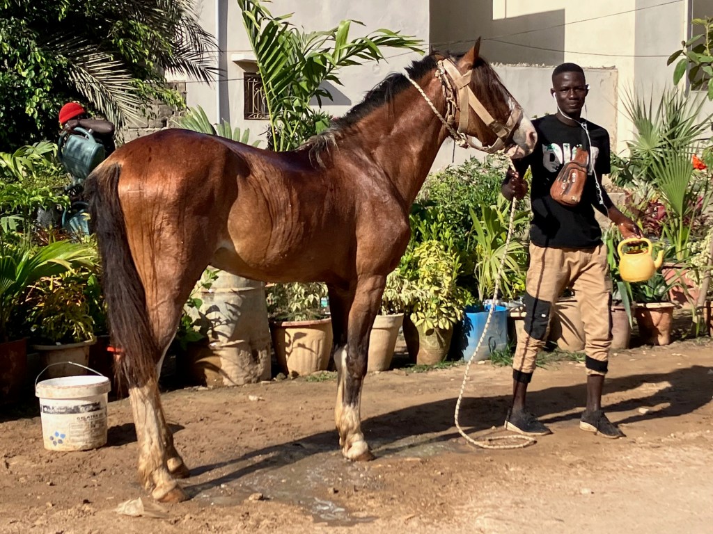 À l’angle de l’avenue, une dizaine de chevaux sont au repos dans une écurie improvisée. À quelques pas, un charretier lave et soigne son cheval, devant un étalage de plantes vertes : étonnamment, ici comme un peu partout le long des artères principales de Dakar, le long de la corniche du bord de mer surtout, d’immenses files de plantes en pots plus ou moins hautes attendent le client. Les vendeurs sont souvent invisibles, ils se reposent derrière les écrans de feuillages. Car dans cette ville plantée sur un ancien volcan, dans un paysage presque désertique, si on a la chance d’avoir une cour, fût-elle de quelques mètres carrés, on se fabrique de mini-forêts. Et tant pis si ça attire les moustiques.