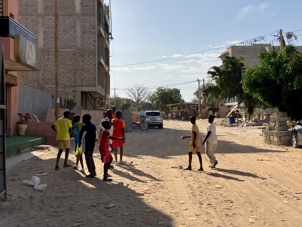 Les enfants d’un club de sport se regroupent. Quelques jeunes vont à la mosquée. Sous un abri là-bas, mi-ombre mi-soleil, patientent de jeunes talibés (des enfants des rues dépendant d’une daara, une école coranique), pieds nus et leur boîte vide à la main : ils attendent que l’animation reprenne pour commencer à mendier.