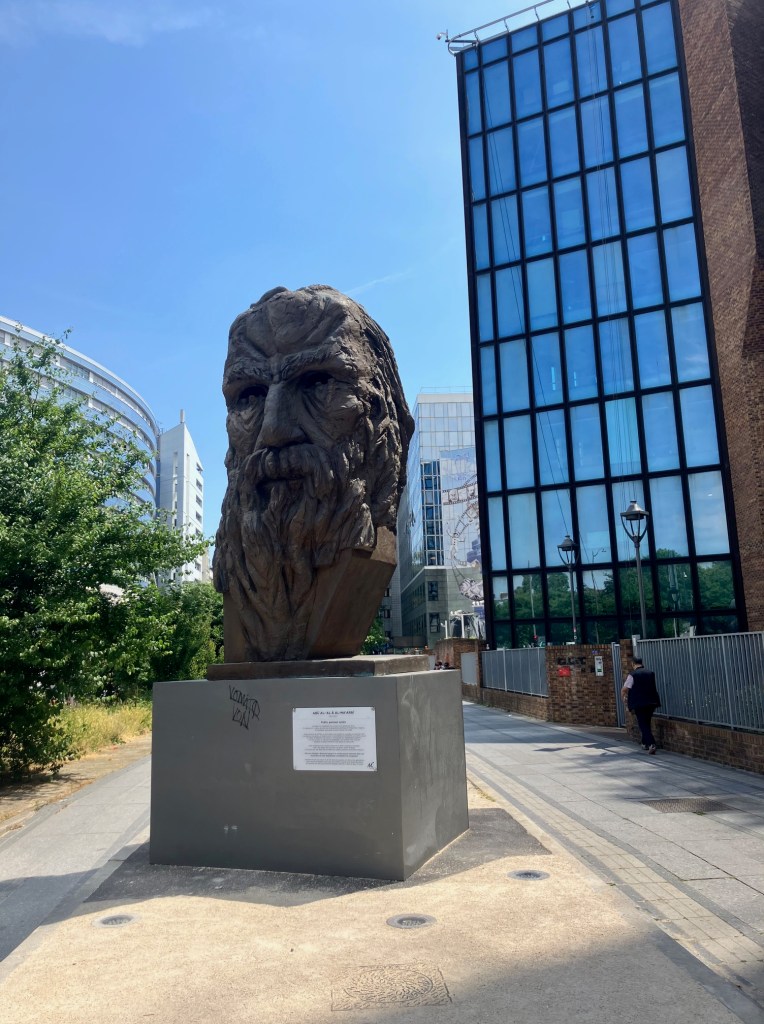 C’est le sculpteur syrien Assem al Basha qui l’a fabriquée – c’est fou comme il ressemble à al-Ma’arrî – et depuis mars dernier, elle a été érigée ici, « réfugiée à Montreuil jusqu’à ce qu’elle puisse retourner dans une Syrie libre de tout despotisme, extrémisme et occupation », dit son cartel.
