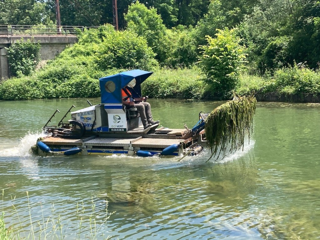 Le canal de Bourgogne, toujours – un tourisme au compte-gouttes, l’été. Quelques cyclistes qui ne s’arrêtent pas toujours, entre le château de Tanlay et celui d’Ancy-le Franc. Et plus rares encore, les bateaux. Encore faut-il qu’ils puissent naviguer, sur cette eau remplie d’algues. Justement ce matin, sur le chemin de halage, un préposé de VNF surveillait nonchalamment la machine qui extrayait les longues masses vertes… Il en faudrait bien une dizaine, pendant des jours et des jours, pour en venir à bout.