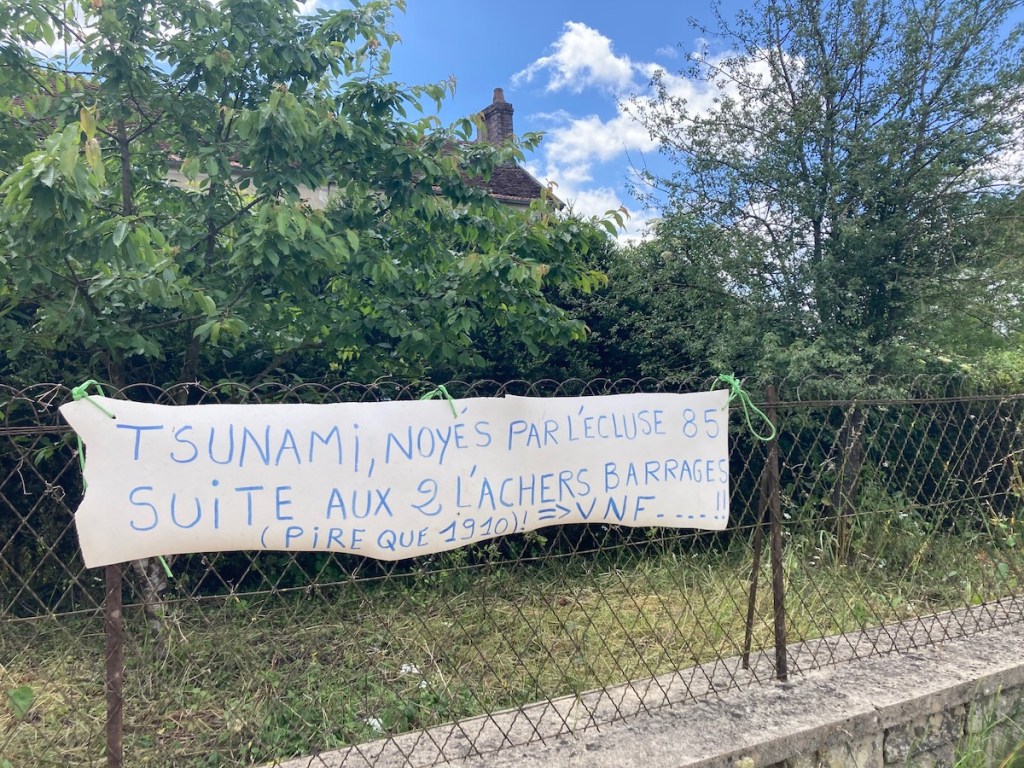 Le remembrement des années 1950 a fait d’un paysage de bocage, un pays de vastes openfields bordés par les forêts. Au village, quelques grosses fermes bien closes, et un exploitant aux abois, après l’inondation du printemps : route nationale, au coin du canal, il a accroché une banderole : Tsunami, noyés par l’écluse 85. Il accuse VNF – Voies Navigables de France. Je vous ai raconté cette histoire, le 15 avril.