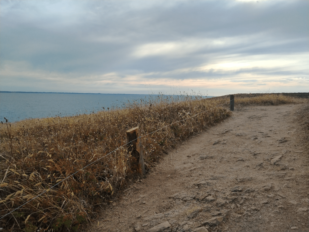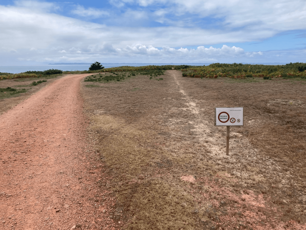 Cette année, les autorités en charge du littoral sont intervenues de façon significative sur l’île : les abords des plages étaient défoncés chaque année par les marées, et par le flux des estivants – on y a construit des pontons de bois pour les protéger, et pour y accéder aisément. Et puis on a tendu tout au long du sentier côtier, un fil de fer entre des piquets : le troupeau des piétons (tout relatif, comme tu peux voir sur les images de cette page) est canalisé, empêché de s’égayer sur la lande, les rochers. Désormais, on risque moins de s’écraser au pied des falaises, mais on ne peut plus – sauf en bravant l’interdit, en enjambant la clôture – on ne doit plus marcher librement dans la lande, à l’aventure.