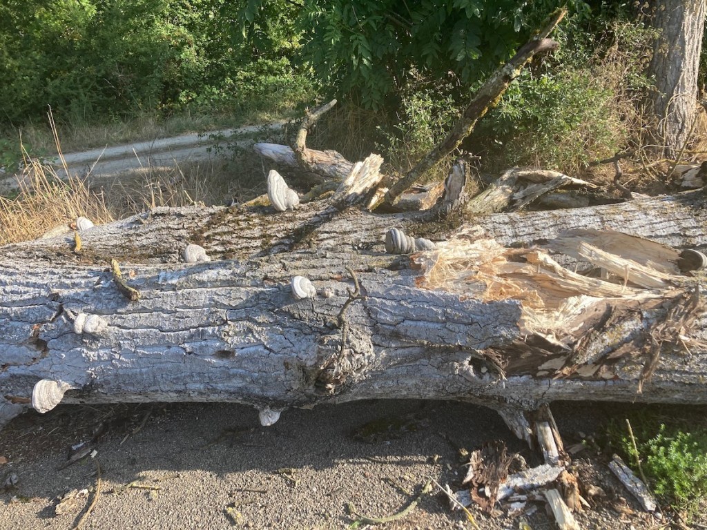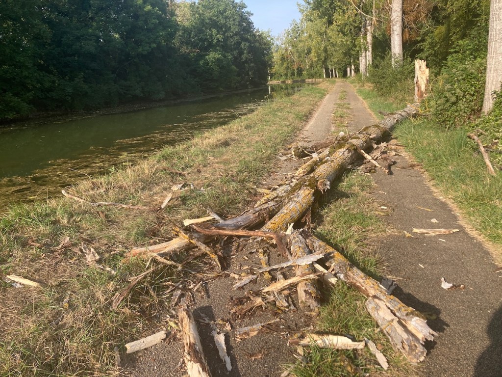 Hier soir, tout d’un coup, le vent a soufflé très fort. Et ce matin, en marchant le long du canal, j’ai découvert que la tempête s’était chargée de ce que les humains avaient négligé là depuis un bon moment – le soin des morts. Car un, deux, dix, vingt cadavres barraient le chemin de halage. Et ils étaient morts depuis longtemps, ces peupliers, tués par l’âge, ou par des amas de gui, ou par des colonies d’amadouviers, ces bizarres champignons bouffeurs d’arbres. Mais morts debout. Le long du chemin, beaucoup d’autres grands arbres morts sont encore là, dressés dans le ciel, immenses, avec leur longs bras maigres – ils attendent la prochaine tempête. Ou bien te tomberont dessus un beau jour, sans crier gare – quand ils auront passé le mur du son.