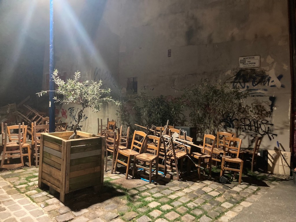 Or à part le coin de ma rue, cet air-là n’avait rien à voir avec cette image – c’était une chanson de pure nostalgie, alors que ces chaises dans la nuit, c’était une apparition sans mémoire, un présent bloqué, un avenir incertain.