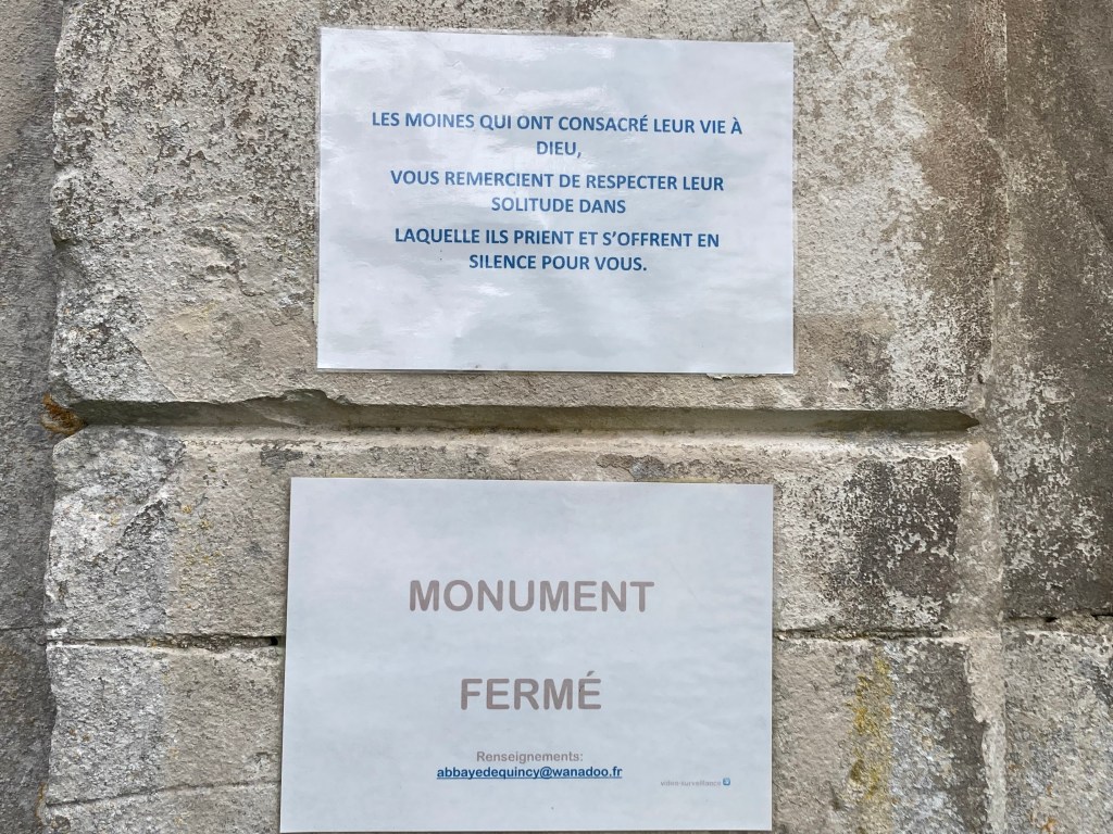J’ai refait le tour de l’abbaye : à l’entrée du parc, à côté des logos Monument historique et La route des Abbayes cisterciennes, il y avait deux panneaux : « Monument fermé », et « Les moines qui ont consacré leur vie à Dieu vous remercient de respecter leur solitude dans laquelle ils prient et s’offrent en silence pour vous ». J’ai trouvé étrange que cette prière s’énonce ainsi au présent, et je me suis demandé qui était ce maître ventriloque d’un temps suspendu, en qui parlaient encore, et s’adressait à nous, la voix de moines disparus depuis des siècles.